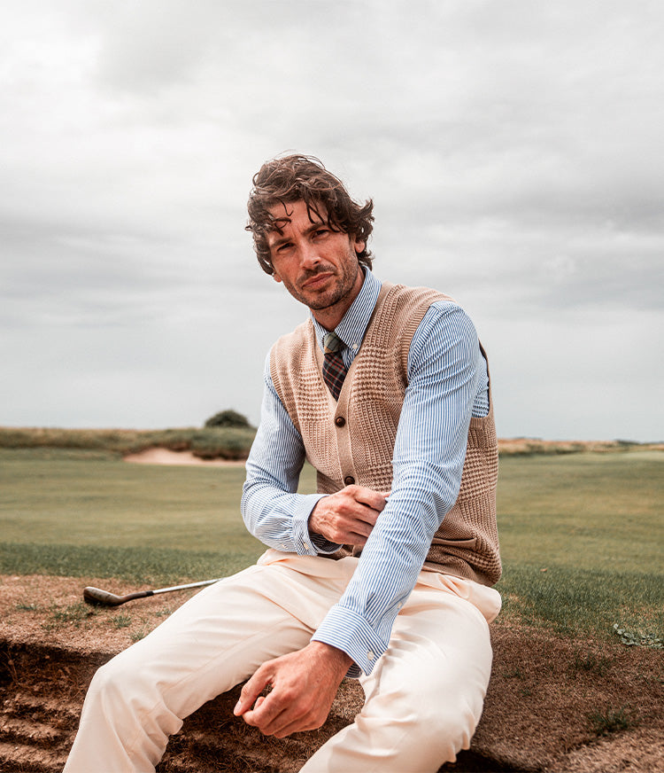 Authentic menswear pattern sweaters paired back to a performance chino tailored bottom blends sophistication
